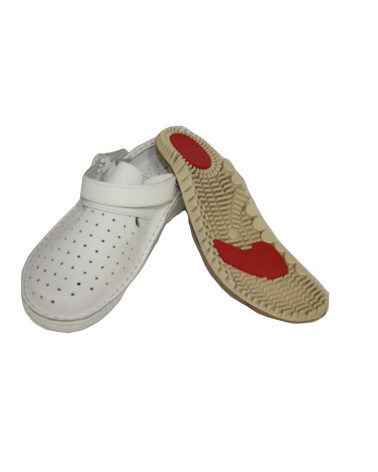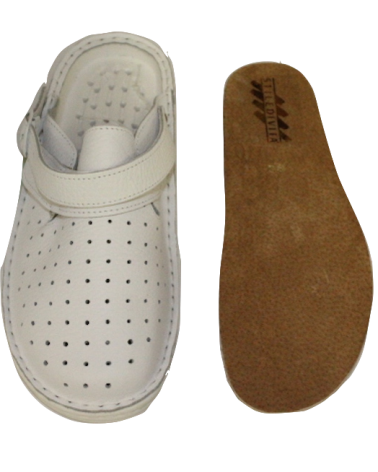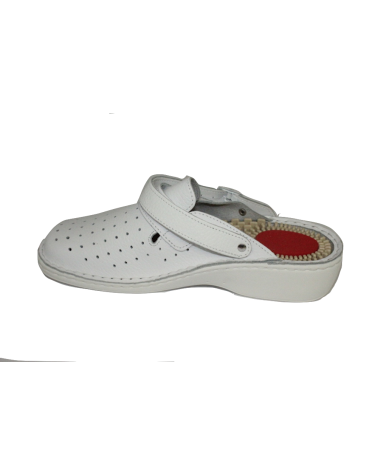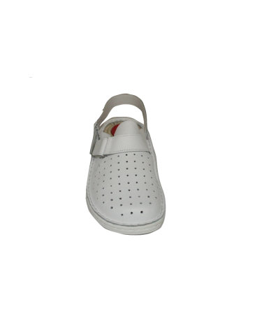 Sabot Stile di Vita in pelle bianca con buchini, regolazione sul collo del piede e cinturino in caviglia che può essere portato sul collo del piede. Plantare estraibile e rerversibile. Suola antiscivolo leggera e ammortizzante. Tomaia morbida in pellame e concia naturali, cucita a mano, sistema per la circolazione dell'aria. Alta flessibilità per il massimo comfort.