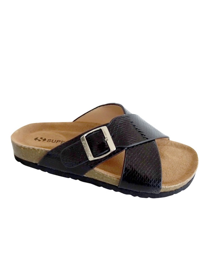 Ciabatta Superga anatomica S11S864 anatomica nera con incrocio e fibbia regolabile. La tomaia è in similpelle lucida nera e l'appoggio morbido è in pelle. Il battistrada è in gomma. E' una ciabatta molto comoda da indossare piedi nudi ed è utilizzabile come un sandalo.