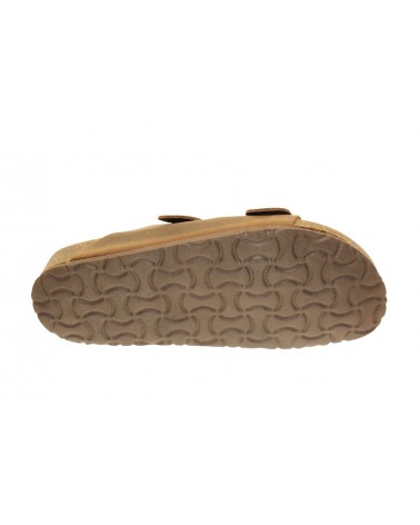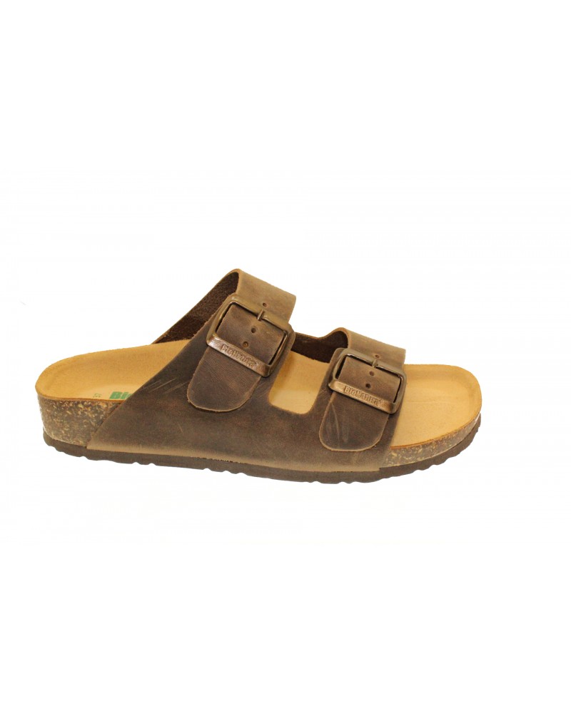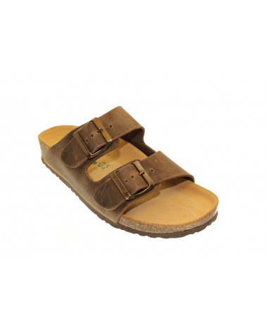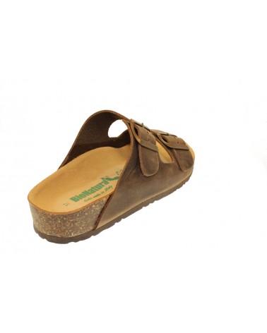 Ciabatta anatomica Bionatura in pelle crazy horse color caffè con sottopiede anatomico imbottito e battistrada in gomma. Tomaia regolabile con doppia fibbia.