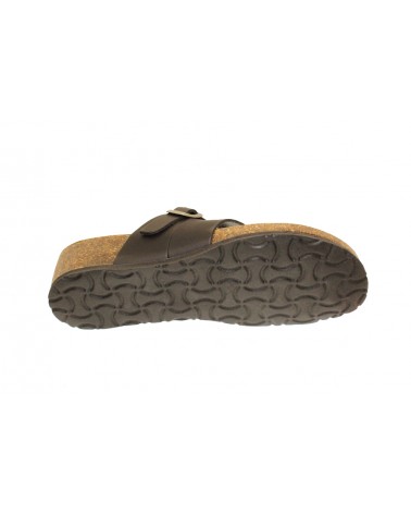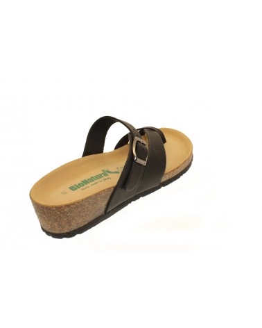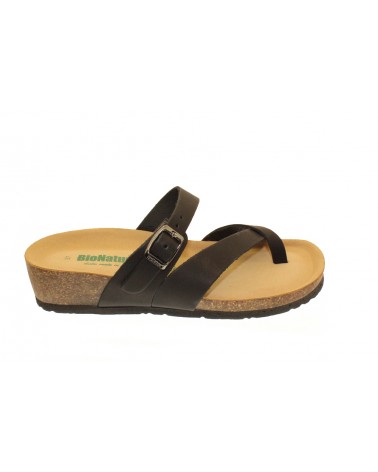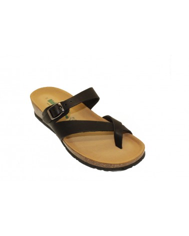 Ciabatta infradito Bionatura in pelle nera con cinturino sul collo del piede. Zeppa alta 3 cm. Appoggio anatomico.