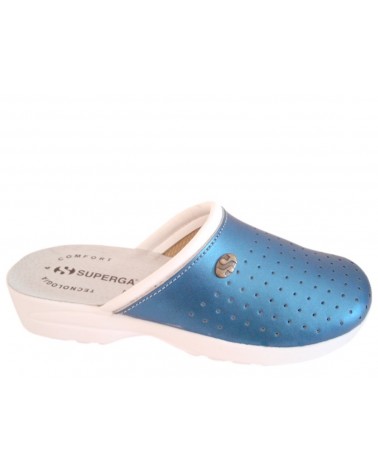 La ciabatta Superga 601 è il classico sabot sanitario anatomico in pelle con buchini, il sottopiede è in pelle e la zeppa in gomma. Versione rivisitata in un insolito colore blu marin lucido. Ideale da lavoro ma anche per la casa.