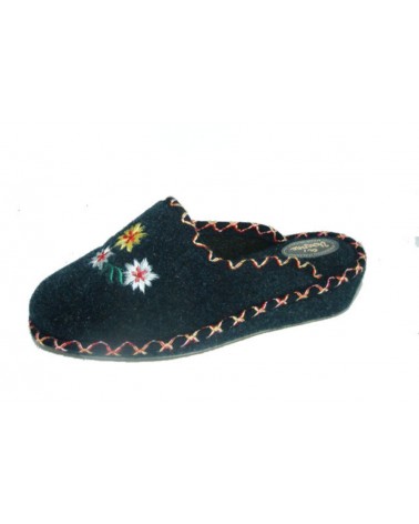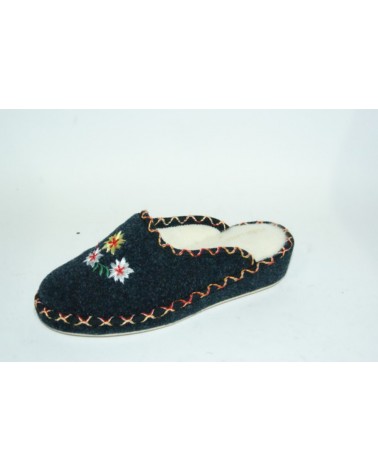 Ciabatta in caldo panno invernale blu, ricamo di ispirazione tirolese, zeppa cm 3 e fondo in gomma. Prodotto artigianale italiano. Calzata leggermente piccola: si consiglia un numero più grande di quello indossato normalmente.