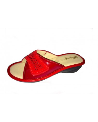 Ciabatta Susimoda in camoscio e vernice rossi. Chiusura a strappo, morbido appoggio, suola in gomma antiscivolo alta 3 cm.