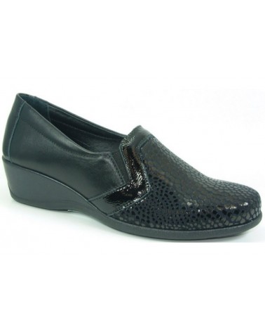 Scarpa Susimoda realizzata in pelle nera e tomaia in tessuto tecnico elasticizzato molto confortevole. Zeppa in gomma 3 cm.