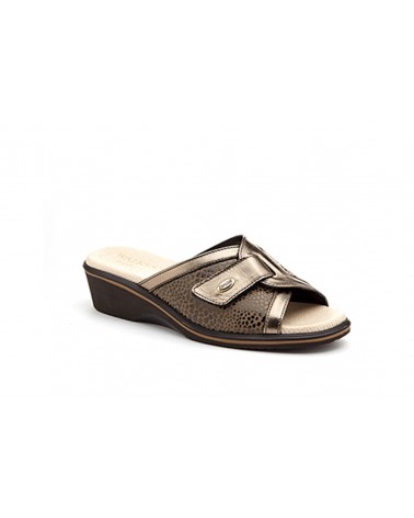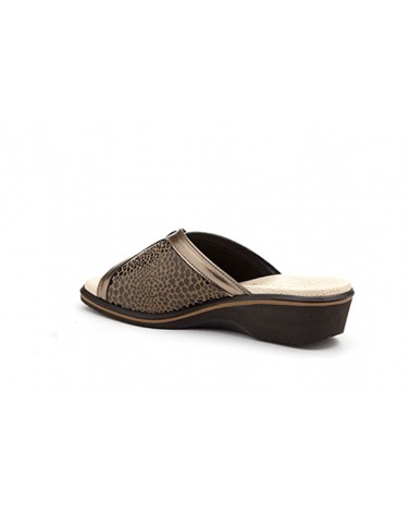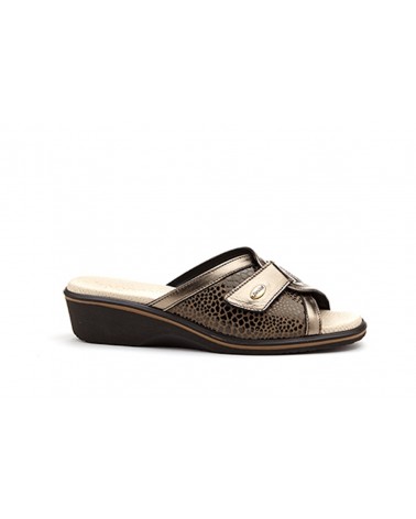 Ciabatta anatomica Susimoda1016 in pelle peltro con tomaia elasticizzata e regolazione con strappo. Zeppa 3 cm, fondo antiscivolo.