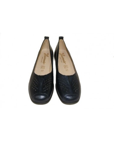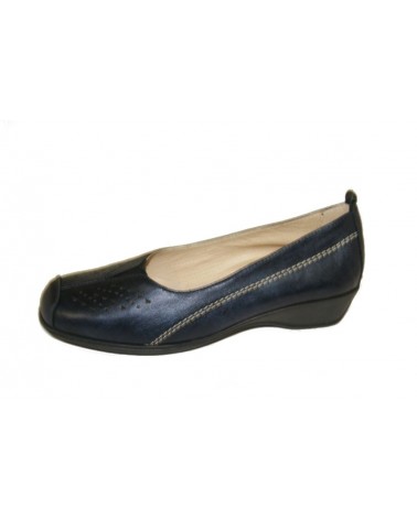 Scarpa estiva scollata Susimoda 4205 linea Dynamic Flex realizzata in pelle blu traforata con fodera in pelle chiara. La scollatura è contenitiva ma non costringe grazie ad un piccolo inserto elasticizzato. La zeppa è in gomma nera ed è alta 3 cm.