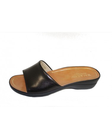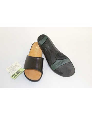 La ciabatta Susimoda 1793 ha una semplice fascia in pelle nera e l'appoggio realizzato in vero cuoio. La tomaia è foderata in pelle chiara e la zeppa in gomma antiscivolo è alta 3 cm.