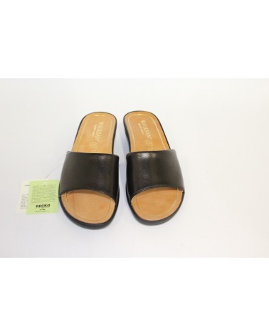 La ciabatta Susimoda 1793 ha una semplice fascia in pelle nera e l'appoggio realizzato in vero cuoio. E' un modello molto semplice che ha il pregio di tenere il piede asciutto anche quando le temperature sono alte. La semplicità della tomaia la rende utilizzabile anche come sandalo. La tomaia è foderata in pelle chiara e la zeppa in gomma geko antiscivolo è alta 3 cm.
