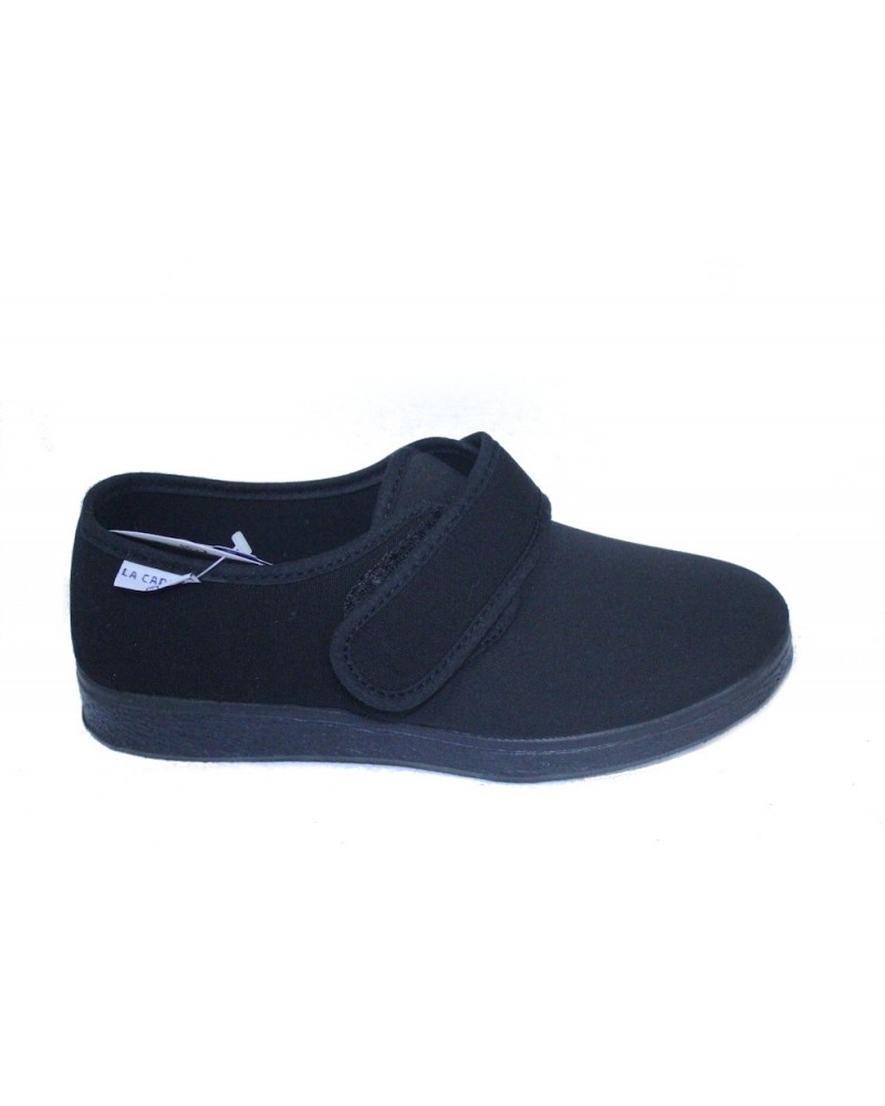 La pantofola estiva La Cadena (modello Ramadoro) è un modello molto adattabile perchè è realizzata in morbida licra nera elasticizzata che si adatta ai piedi anche più difficili. La chiusura è regolabile con strappo, la suola è in gomma, l'altezza è 2 cm.