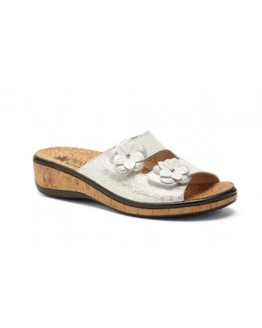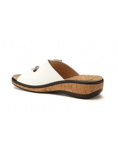 La ciabatta Susimoda 1804, linea Walksan con sottopiede estraibile in pelle, è realizzata in morbida pelle bianca con fodera in pelle chiara e tomaia regolabile con doppio strappo decorata con un decoro floreale. La chiusura regolabile garantisce una buona regolazione anche in caso di inserimento di un plantare personalizzato. E' un modello molto leggero, comodo e fresco.