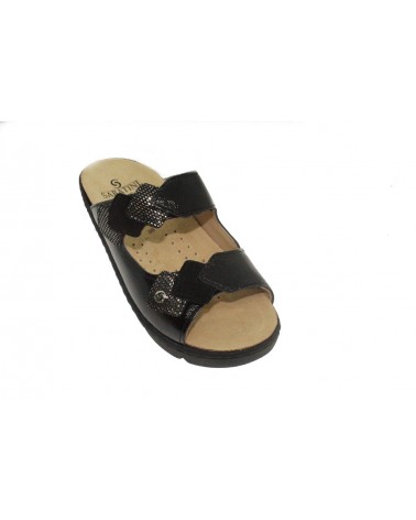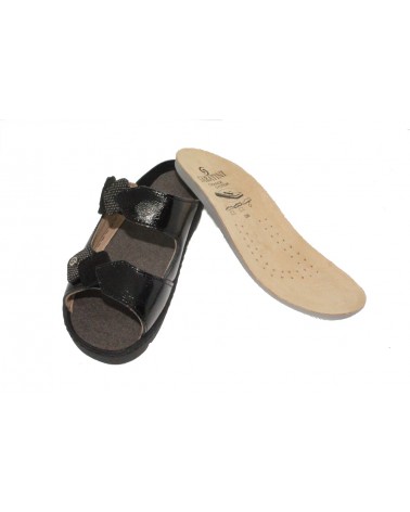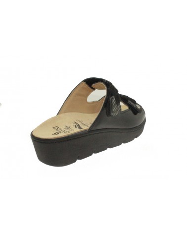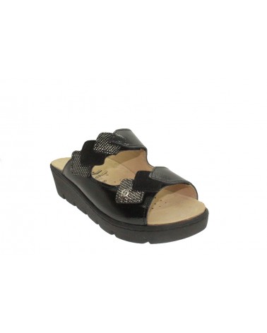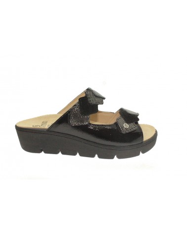 Ciabatta Sabatini 1065 in pelle lucida nera con plantare estraibile in pelle e chiusura regolabile con doppio strappo. Zeppa in gomma alta 4 cm.