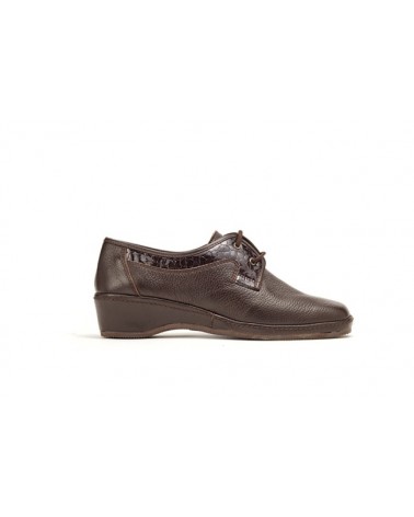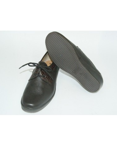Scarpa Susimoda anatomica allacciata, realizzata in morbidissima pelle di cervo color testa moro con riporti in vernice. Pianta larga, lavorazione california, zeppa 3cm.