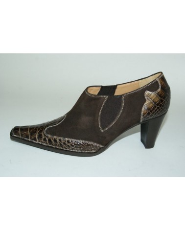 Stivaletto tronchetto tipo texano Brandoni in pelle scamosciata marrone e riporti in pelle stampata cocco, con speciale lavorazione a sacchetto che rende la suola in cuoio molto flessibile. Mezza piantina in gomma, fodera pelle.