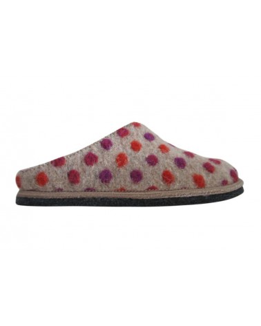 Pantofola Superga in lana cotta beige con pois rossi e viola. Molto avvolgente, calda e comoda ha all'interno un sottopiede estraibile.
