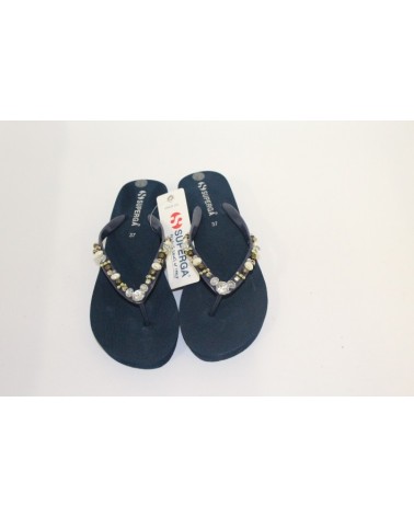 Ciabatta infradito Superga in gomma blu con decorazioni sul listino. Zeppa 3 cm.