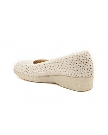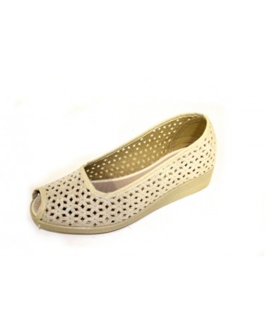 Pantofola scollata Susimoda linea Papavero 4787 in tessuto beige iridescente. E' aperta in punta e ha una zeppa in gomma alta 3cm.