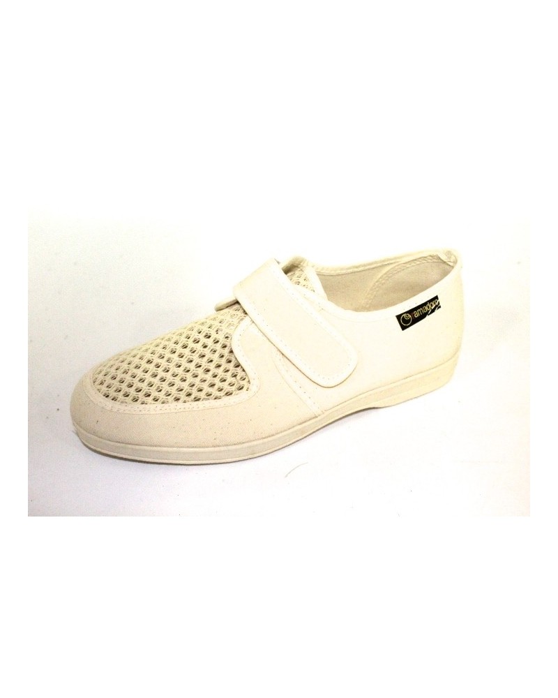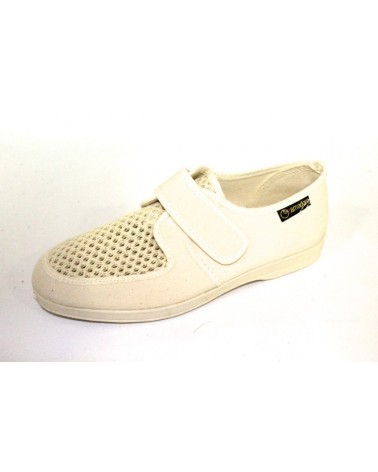 Pantofola Ramadoro in cotone beige con strappo. Tomaia con vaschetta in rete traforata, fondo in gomma.