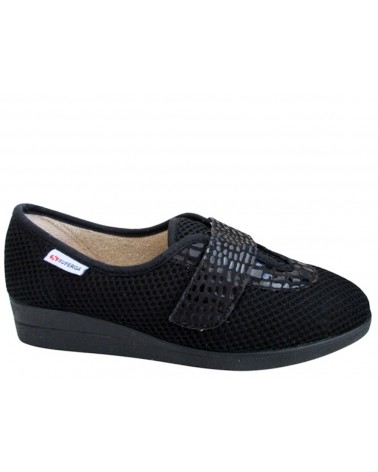 La pantofola estiva Superga S10P540 è realizzata in morbido tessuto a nido d'ape nero con la chiusura a strappo in tessuto stampato nero. La zeppa in gomma è alta 3 cm. E' un modello morbido e leggero, comodo nella stagione primavera estate.
