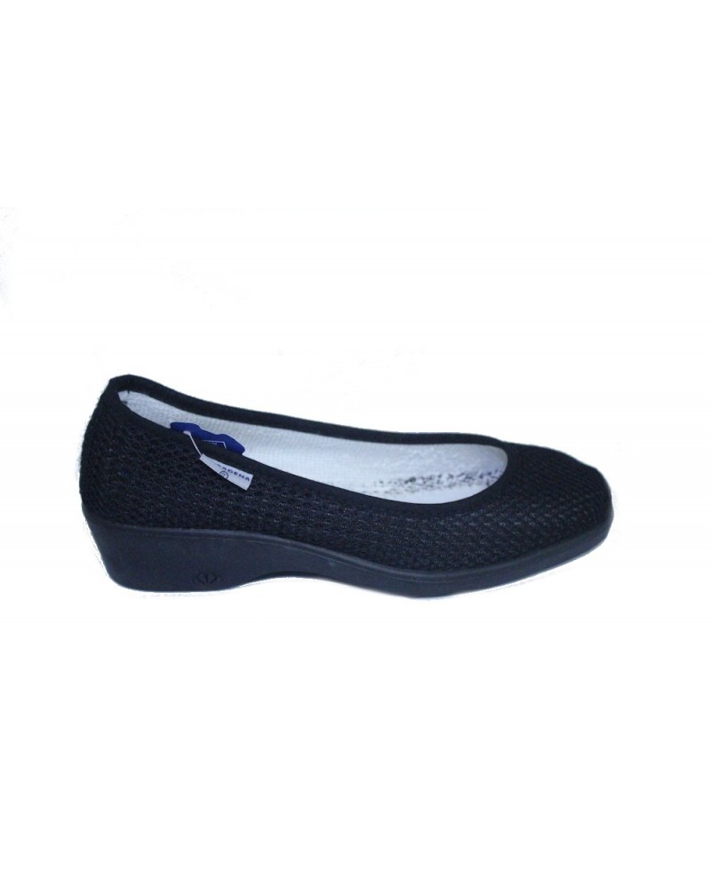 La pantofola estiva La Cadena 51020 (modello Ramadoro) è una ballerina in morbido cotone nero a nido d'ape con fodera in tessuto bianco e una piccola zeppa in gomma alta 2 cm. E' un modello morbido e leggero, adatto per la primavera estate.