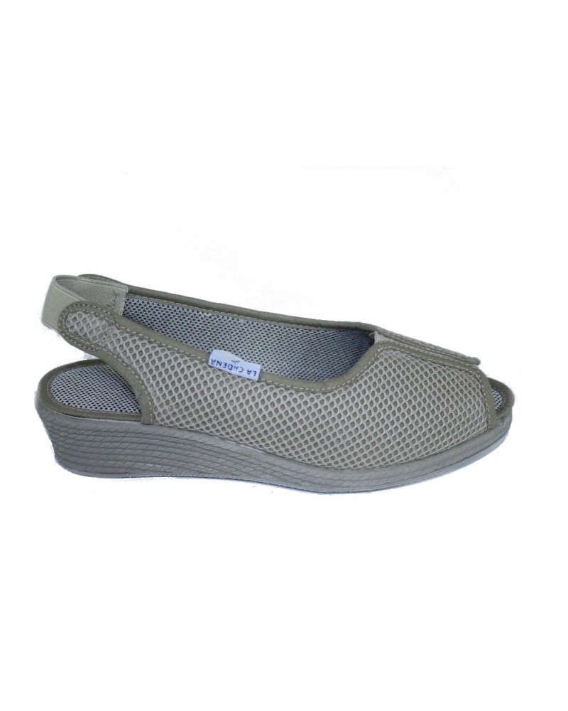 Pantofola aperta La Cadena 70400 (modello Ramadoro) scollata e realizzata in morbido tessuto beige con inserti elasticizzati. Zeppa in gomma 3 cm.