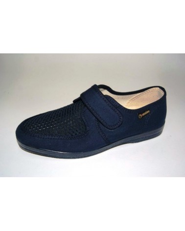 Pantofola Ramadoro in cotone blu con strappo. Tomaia con vaschetta in rete traforata, fondo in gomma.