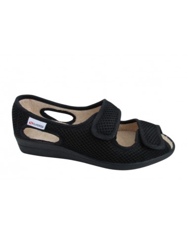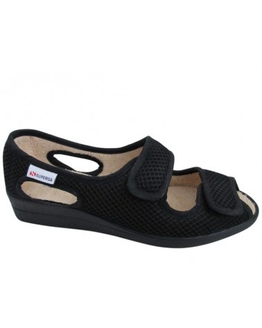 Comoda pantofola estiva Superga S10I299. E' un modello aperto regolabile con doppio strappo realizzata in morbido  tessuto nero. La zeppa in gomma è alta 3 cm.
