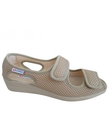 Comoda pantofola estiva Superga S10I299. E' un modello aperto regolabile con doppio strappo realizzata in morbido  tessuto beige. La zeppa in gomma è alta 3 cm.