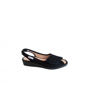 Il sandalo Superga S01R166 è una pantofola estiva aperta in morbido tessuto nero lavorato a nido d'ape e con regolazione a strappo sul collo del piede. La fodera è in tessuto morbido chiaro e la zeppa in gomma è alta 3 cm.