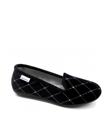 Pantofolina per la casa Superga in caldo velluto nero con decoro a rombi sottili argentati. Suola on gomma naturale.