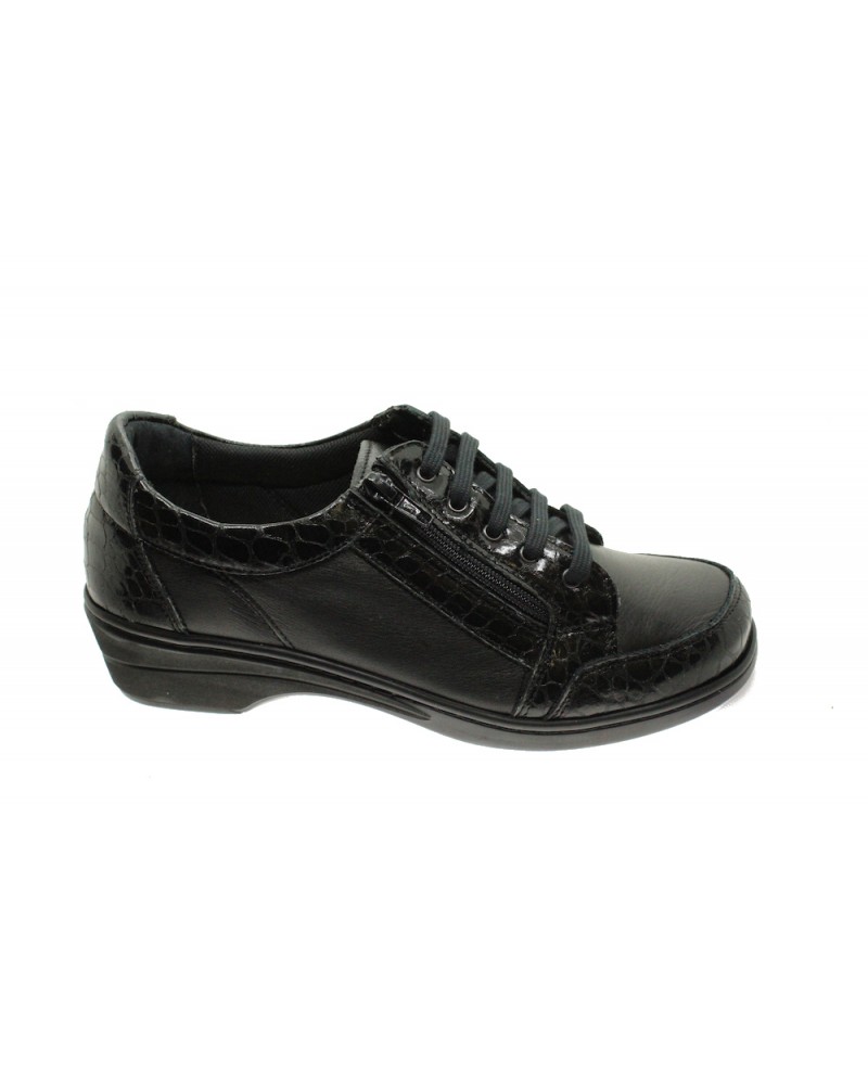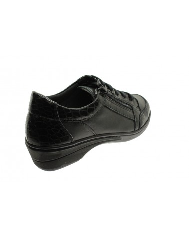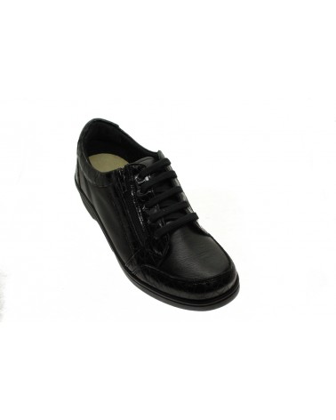 Scarpa Susimoda in pelle nera e riporti in vernice, chiusura stringata. Plantare estraibile, fondo in gomma altezza 3 cm.