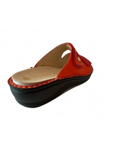 Ciabatta Susimoda 1780 in pelle nabuk rossa, foderata in pelle chiara, anatomica con plantare estraibile e chiusura con doppio strappo regolabile. Fondo in gomma antiscivolo alto 3 cm