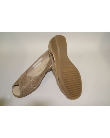 Scarpa sandalo Susimoda 2411 linea DinamicFlex in pelle scamosciata beige.E' un modello scollato spuntato con aperture ai lati. La zeppa in gomma è alta 3,5 cm