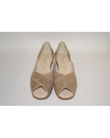 Scarpa aperta Susimoda 2411 linea Dinamic Flex in pelle scamosciata beige con fodera in pelle . E' una scarpa sandalo scollata, con punta aperta e con aperture ai lati. Sostituisce il sandalo e ha una buona vestibilità grazie alla scollatura incrociata e la morbidezza della tomaia che permette di indossarla tranquillamente anche a piedi nudi. La zeppa in gomma è alta 3,5 cm