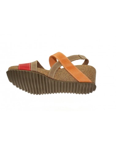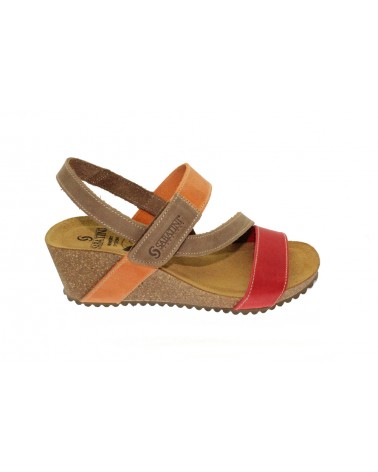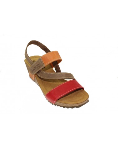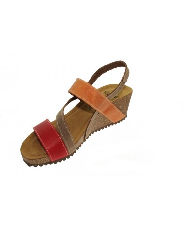 Sandato modello Sabatini 4352 in nabuk beige, arancio e rosso . L'appoggio è morbido, in memory foam. Il cinturino è regolabile con velcro. L'appoggio è morbido e ricorda la forma del tuo piede. E' un modello leggero, che assorbe il peso corporeo e assicura il massimo benessere e la salute del piede. Il cinturino è regolabile sul collo del piede con strappo. La zeppa è alta 5 cm.