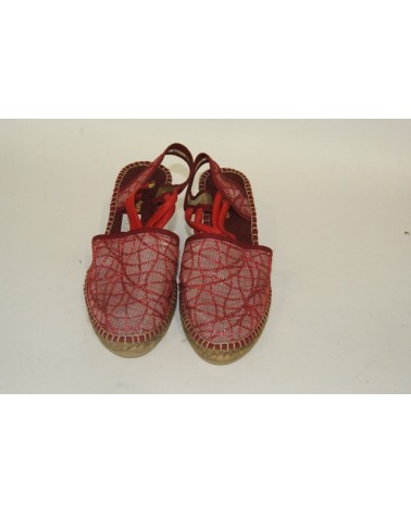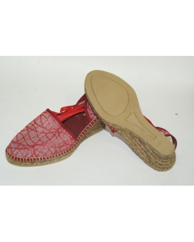 Sandalo Ramadoro con zeppa in corda 6 cm e tomaia in tessuto operato rosso con due inserti elasticizzati per la caviglia.