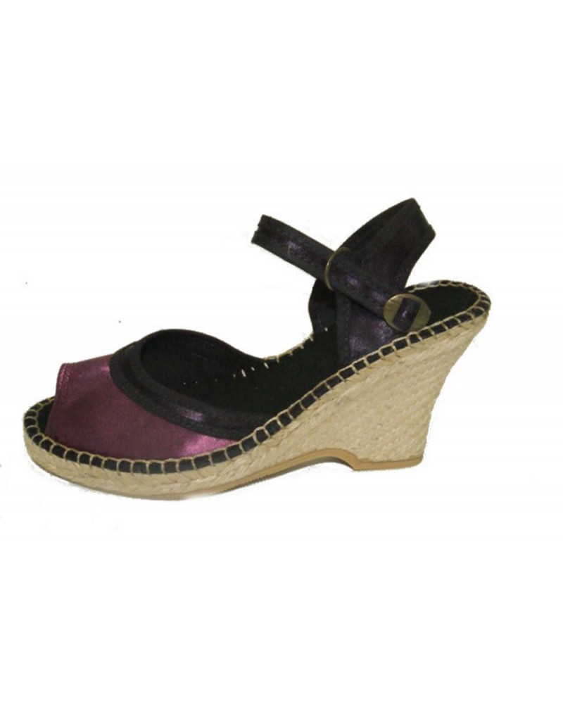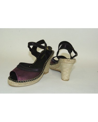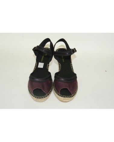 Sandalo con zeppa in corda e tomaia in tessuto color prugna con cinturino regolabile in caviglia.