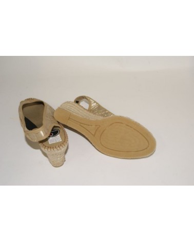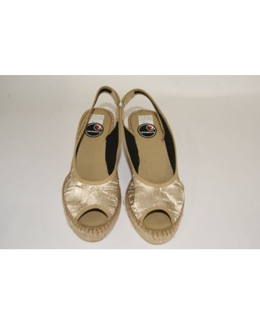 Sandalo decolleté Ramadoro con zeppa in corda e tomaia in tessuto goffrato color platino.