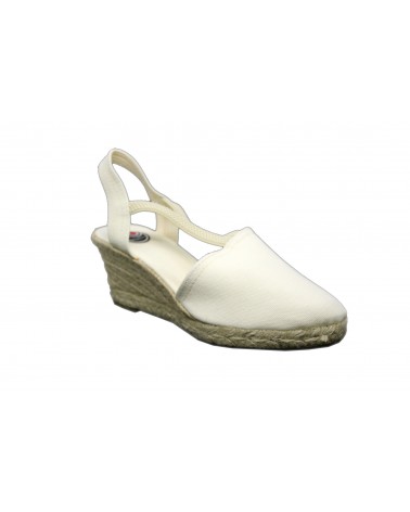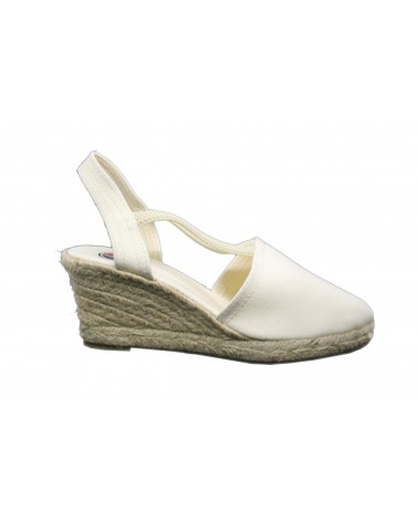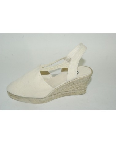 Sandalo in tessuto beige con zeppa in corda cm 6 e suola in gomma. Cinturini elasticizzat