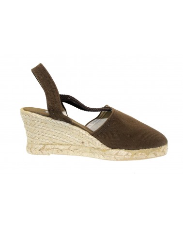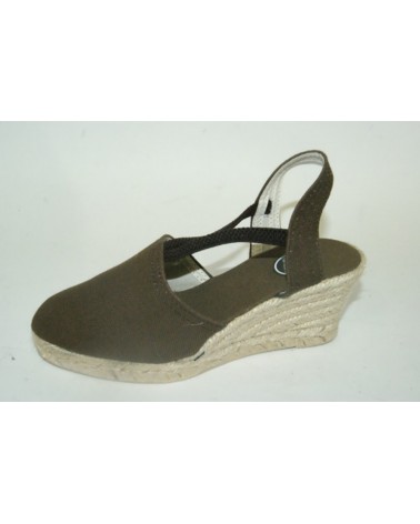 Sandalo in tessuto marrone con zeppa in corda cm 6 e suola in gomma. Cinturini elasticizzati sul collo del piede.