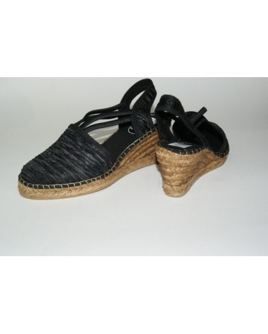SandaloRamadoro in tessuto nero lavorazione plissè, zeppa in corda altezza cm 6,5, suola in gomma.