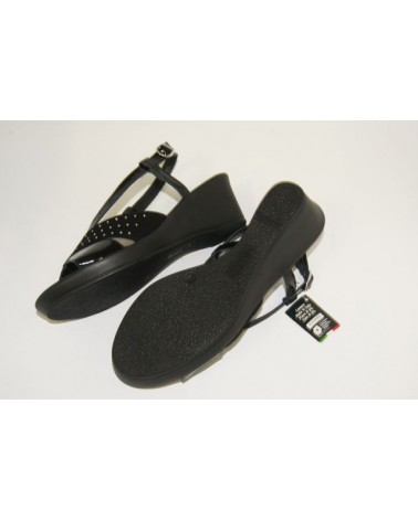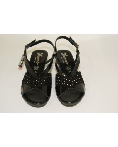 Sandalo Susimoda in vernice e camoscio nero con piccoli zirconi applicati. Cinturino regolabile e zeppa alta cm 5.