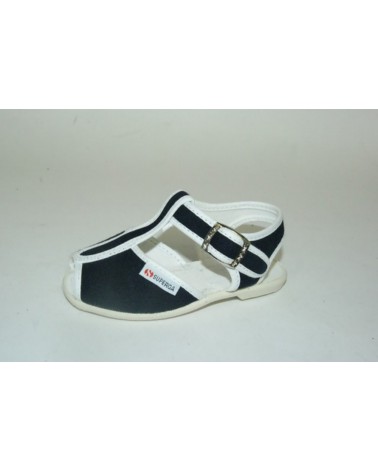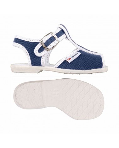 Sandalino in cotone blu doppiato Superga. Profilato in cotone bianco ha la chiusura regolabile e il fondo in gomma leggera e naturale.
