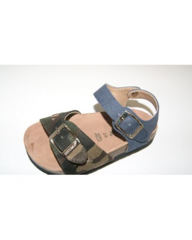 Sandalino Superga con doppia fibbia in tessuto jeans e camoufflage, appoggio anatomico in pelle.
