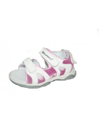 Sandalino Superga da bimba in pelle e tessuto bianco e rosa. Regolazione con doppio strappo sul collo del piede anche in caviglia.Fodera pelle e fondo in gomma