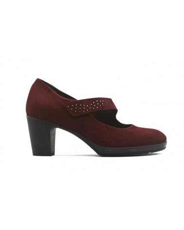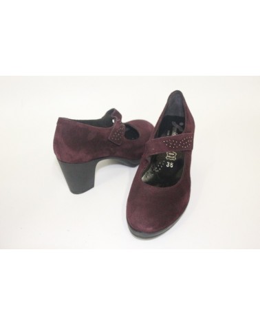 Décolleté Susimoda in camoscio color vinaccia e cinturino con strappo sul collo del piede. Il fondo è in gomma, la fodera in pelle e il tacco è alto 5 cm.