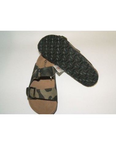 Ciabatta Superga comoda con plantare anatomico in pelle e tomaia in tessuto camouffage con regolazione con doppia fibbia.