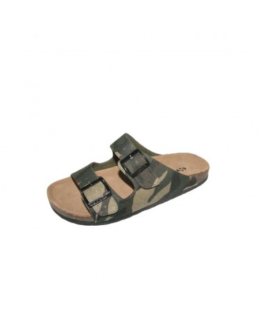 Ciabatta Superga con plantare anatomico in pelle e tomaia in tessuto camoufflage con regolazione con doppia fibbia.